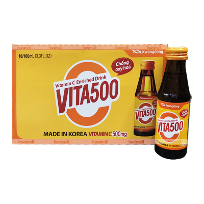 Nước Tăng Lực Vita 500 Kwangdong chai 100ml Vitamin C tồn tại trong các tế bào giúp tái tạo mô, làm ổn định các cấu trúc collagen và có tác dụng chống ô xi hóa. Thiếu vitamin C sẽ làm ngưng quá trình sản xuất collagen và có thể dẫn tới các hội chứng rối loạn.Vitamin C là vitamin của sức đề kháng, sự trẻ trung và sắc đẹp. Tuy nhiên cơ thể không thể tự tổng hợp được loại Vitamin C thiết yếu này và vì thế chúng ta cần phải đưa Vitamin vào cơ thể dưới dạng đồ ăn uống (đồ uống dễ hấp thụ hơn) để cơ thể hấp thụ. Không có hóa chất bảo quản hay các loại hóa chất có thể gây hại đến sức khỏe, cho bạn yên tâm sử dụng
