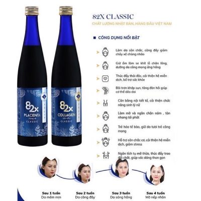Nước uống Collagen và nước uống Placenta của 82X sở hữu công thức đột phá, đa tác động không chỉ dừng lại ở hiệu quả đẹp da, xóa nhăn, ngừa lão hóa mà còn bồi bổ cho sức khỏe, tăng cường đề kháng và nội tiết tố nữ. Bên cạnh hàm lượng dưỡng chất trong mỗi chai cao nhất thị trường hiện nay (120.000mg Collagen và 450.000mg Placenta), việc áp dụng công nghệ thủy phân trong sản xuất khiến kích thước các phân tử trong 82X chỉ bằng 1/100 thông thường với khả năng hấp thu vào cơ thể lên tới 90% sau vài giờ và hoàn toàn thành công trong việc “hồi sinh” làn da phái đẹp chỉ sau 4 tuần sử dụng. Công thức độc quyền chứa 82 loại thực vật lên men chỉ có ở 82X tăng cường thải độc, không gây nổi mụn, nóng trong và tăng cân khi sử dụng.